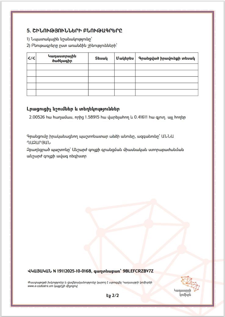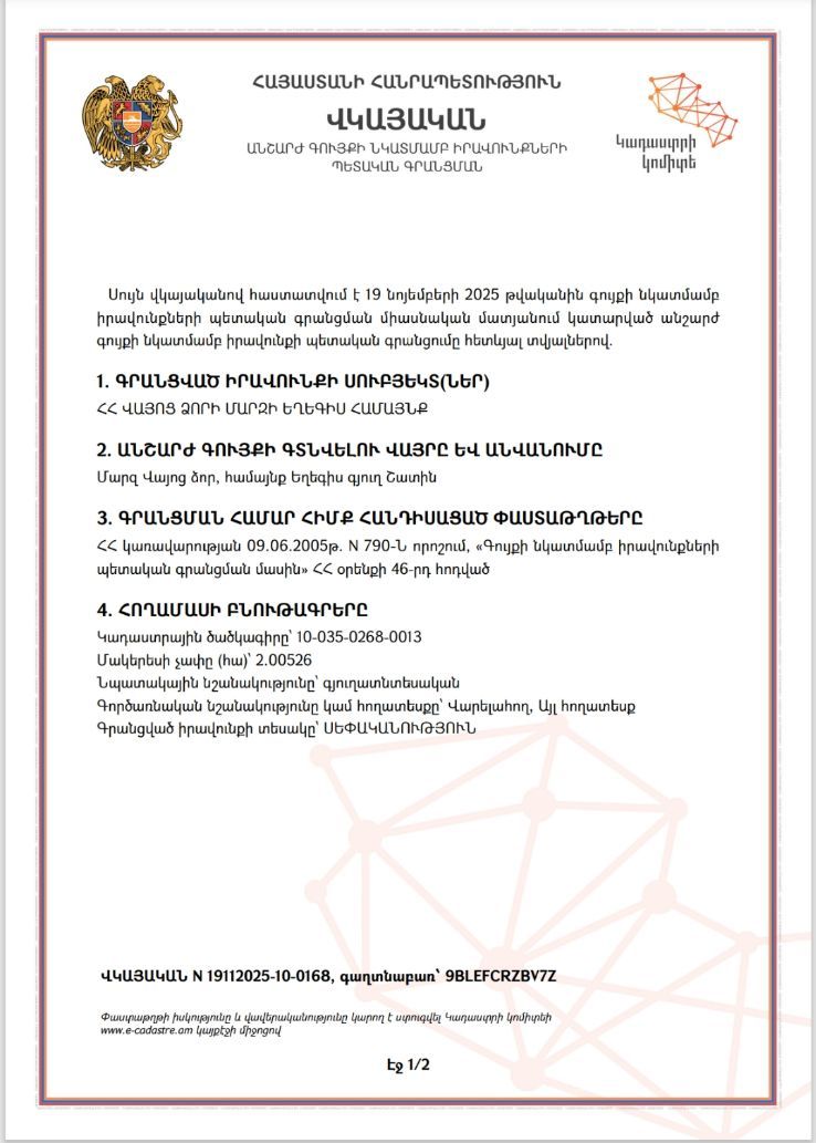 1)կադաստրային ծածկագիր 10-035-0268-0013, մակերեսը՝ 2.00526հա, որից 1,58915հա վարելահող և 0,41611 հա այլ հողատեսք։